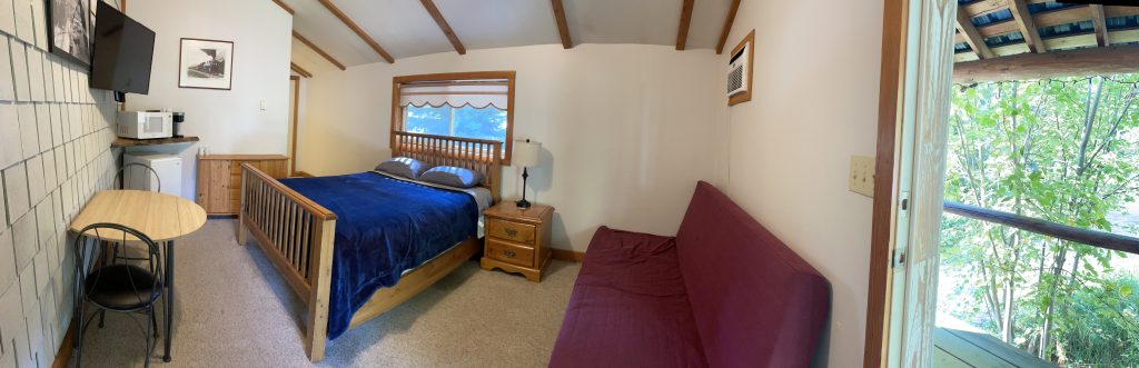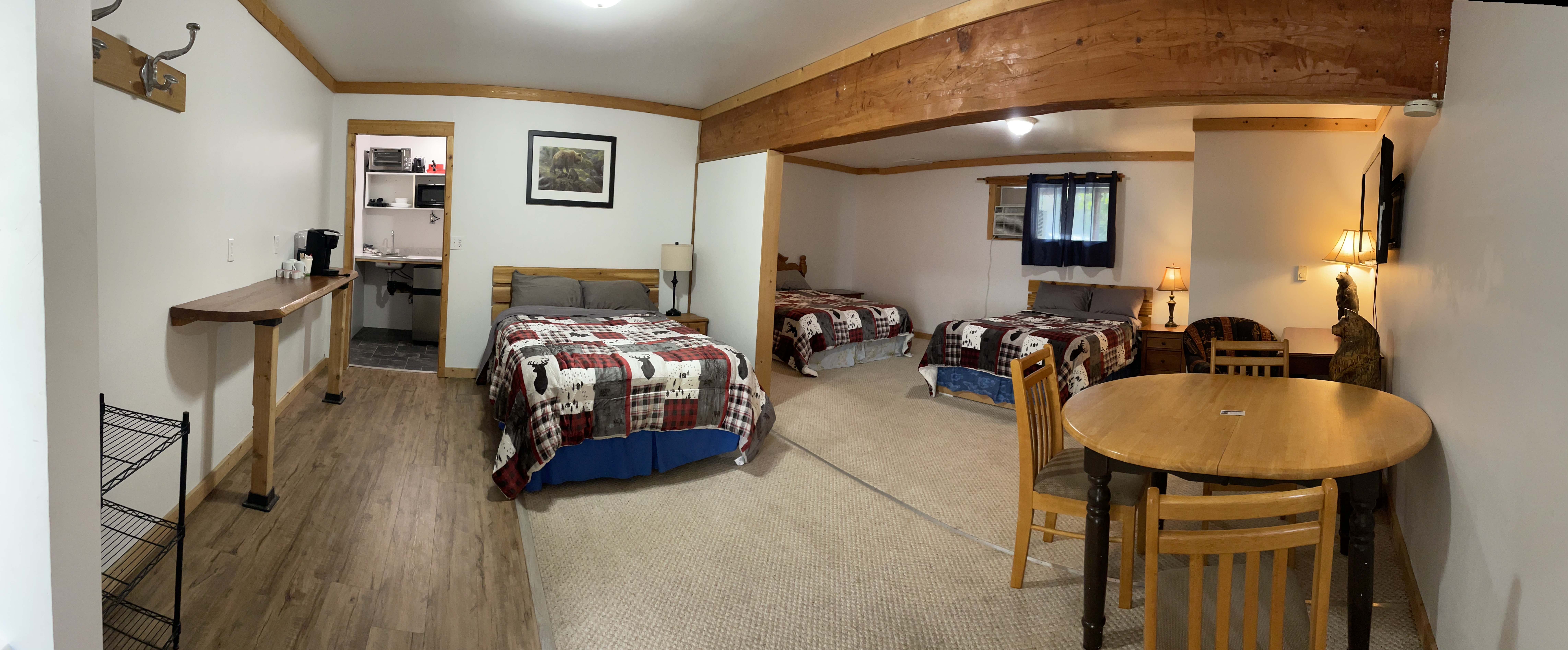 This unit is a self contained room that is tucked away in quiet corner of the maim building. It has it's own private entrance, along with 1 Queen size bed and a Queen size pullout. It is a great option for a couple or someone wishing for a little privacy from their group.